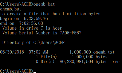 7 echo aa > a.batสร้างแฟ้ม a.bat ที่มีตัวอักษา 2 ตัว แต่แฟ้มจะมีขนาด 4 bytes