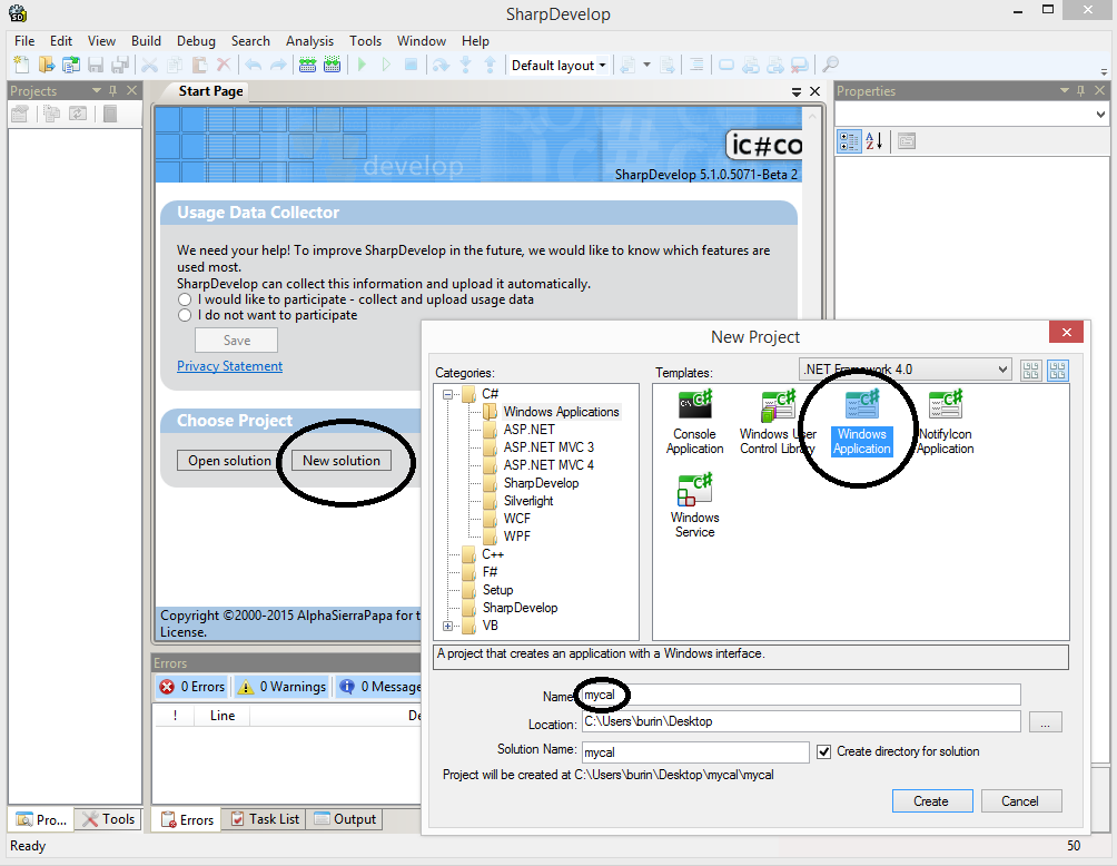 2. เปิดโปรแกรมแล้วสั่ง New solution แบบ Windows Application แล้วตั้งชื่อ Solution