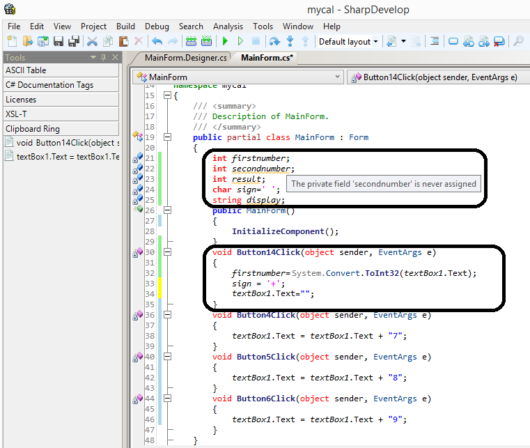 - ใต้ MainForm ประกาศตัวแปร firstnumber, secondnumber, result, sign และ display