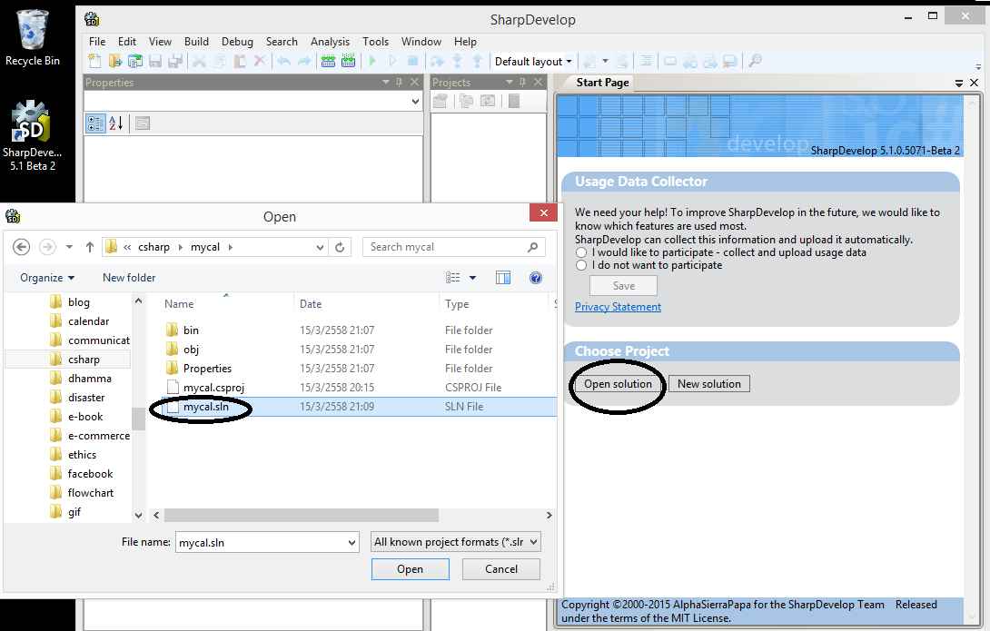 - จะพบแฟ้ม mycal.sln ให้เลือกแฟ้มนี้ เพื่อเปิดงานเดิมมาแก้ไข
