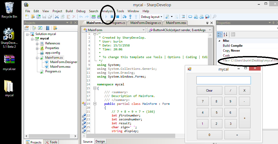 - แฟ้ม mycal.sln คือแฟ้ม solution ที่ใช้เปิดแฟ้มทั้งหมด หากต้องการแก้ไขงานในภายหลัง