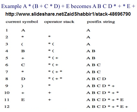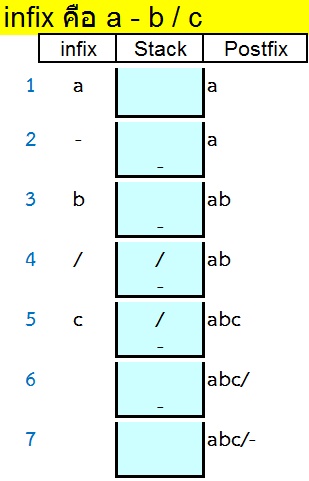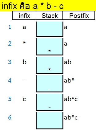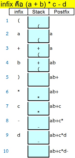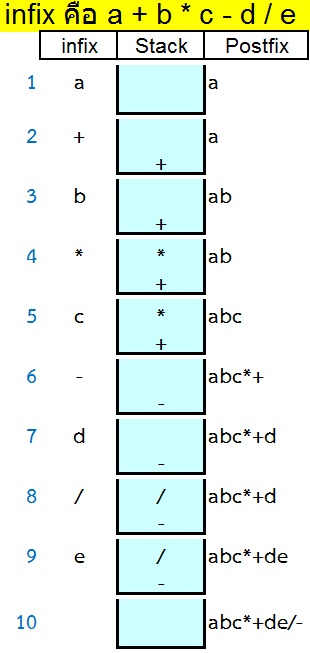 โจทย์ให้ฝึกแปลงจาก infix เป็น postfix โดยใช้ stack ตามตัวอย่าง 1. a + b - c * d / e - f + g * h 2. a * b - c * d + e - f + g * h 3. a + b * c * d / (e * f) * g + h 4. a + b - (c * d) - e - f + g - h 5. a + (b + c) * d / e + f / g * h 6. a / b * c * d * (e - f) + g ^ h 7. (a ^ b) / c * d / e - f + g + h 8. a * b ^ c * ((d - e) - f) * g - h 9. a + b - c ^ ((d - e) - f) * (g - h) 10. a / (b + c) * (d + (e + f)) ^ g + h