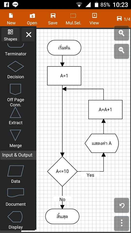ไหน ๆ ก็เห็นชาวโลก มี Smart phone อยู่ในมือมันมากมาย ที่เรียกว่า Handheld Computer นั่นหละ ครั้งได้ค้นใน google play store ก็พบกับแอพดี ๆ ที่ชื่อ Flowdia Diagrams Lite เขียนแผนภาพได้หลายแบบ และผังงาน (Flowchart) ก็เป็นแผนภาพหนึ่ง ที่เขียนได้สวยงาม รองรับภาษาไทย สามารถ capture ภาพ หรือเก็บเป็น png หรือ pdf แล้วส่งให้เพื่อน share ผ่าน social media ได้เลย รุ่นฟรีมีข้อจำกัด คือ สร้างได้ 4 แฟ้ม หากส่งเป็นภาพออกไปก็จะติดลายน้ำ