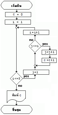 4. จงเขียนอัลกอริทึม และรหัสเทียมของผังงานตามภาพที่มีเฉพาะตัวแปร i กับ j และ c
