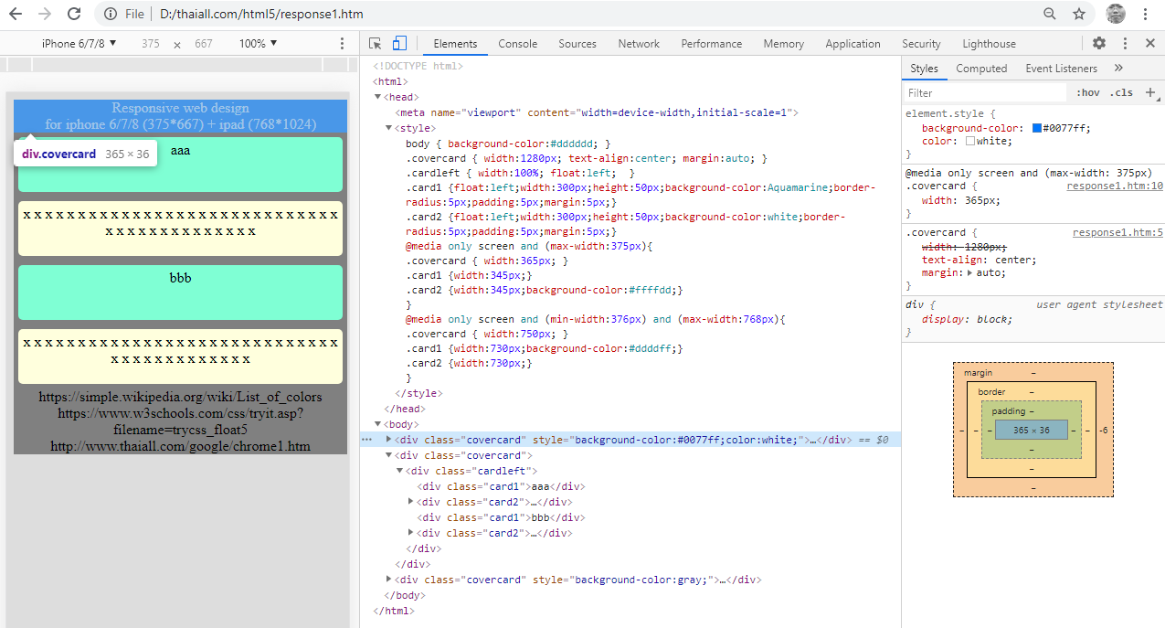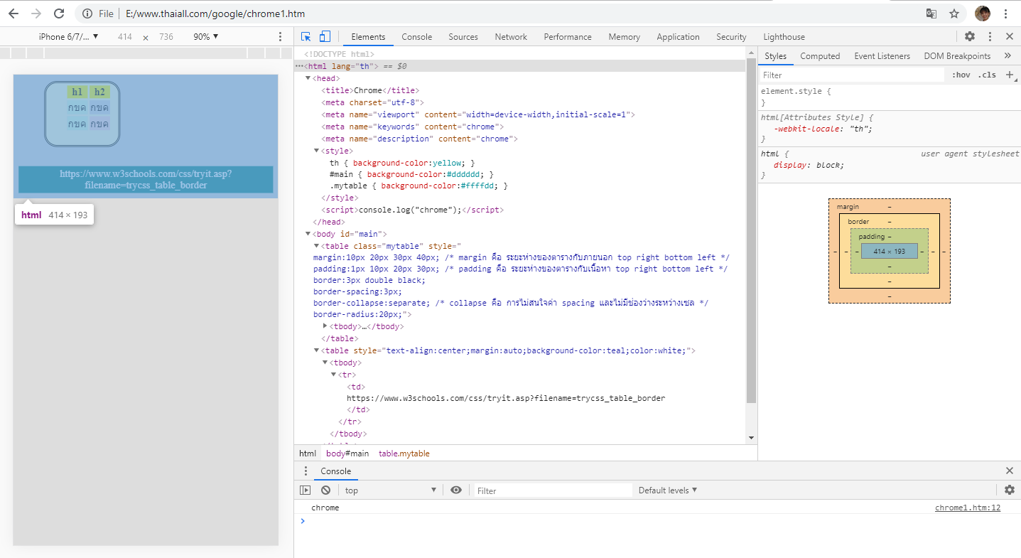 การใช้ Developer Tools ด้วยการกด F12, Ctrl+Shift+I หรือ เข้า Customize ของ Chrome, More Tools, Developer Tools ใน Tab elements ใช้เครื่องมือ Select an element แล้วใช้ Mouse click ส่วนใดของ content ก็จะแสดง HTML code ในหน้าต่าง Element แล้วจะพบรายละเอียด Style ที่มาจากแฟ้ม CSS หรือที่กำหนดใน HTML code ทำให้ทราบว่าการแสดงผลนั้นมาจาก แฟ้มใด ด้วยคำสั่งใด และสามารถแก้ไขเพื่อทดสอบให้เห็นการเปลี่ยนแปลงได้ทันที ตัวอย่างของช้างเชือกนี้ก็แสดงผลไม่ถูกต้อง ต้องใช้เครื่องมือช่วยวิเคราะห์โค้ด เพราะเมื่อแยกโค้ดไปทดสอบแบบไม่มี Doctype พบว่าถูกต้อง แต่ที่ html.htm ไม่ถูก