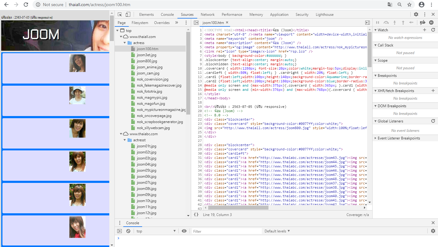 - เลือก Sources - พบรหัสต้นฉบับทั้งของแฟ้มเว็บเพจ และแฟ้มที่เกี่ยวข้องทั้งหมด - คลิ๊กชื่อภาพก็จะแสดงภาพเป็น preview ให้ตรวจสอบได้ง่าย