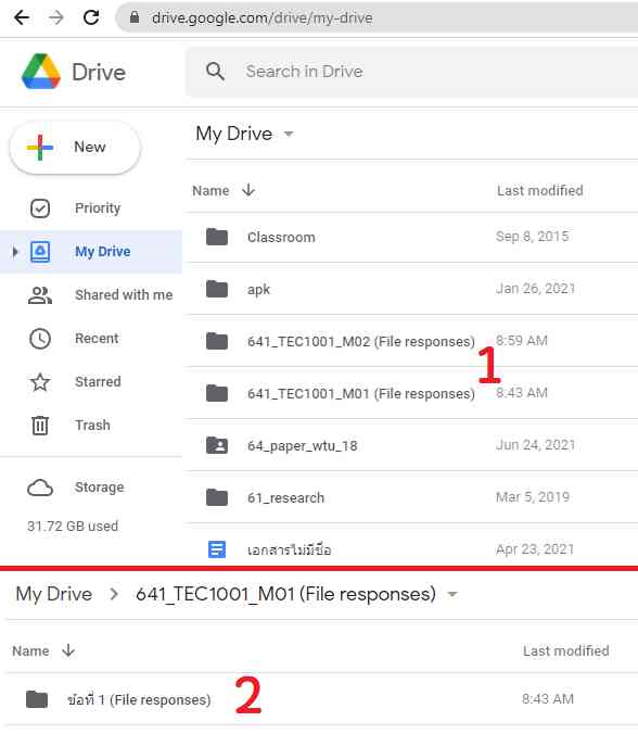 | คลิ๊ก View folder จะพาเข้า My Drive, TEC101temp (File responses), q1 (File responses) |