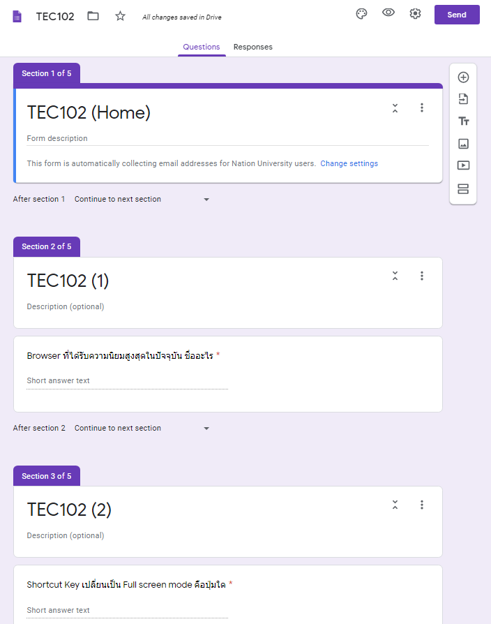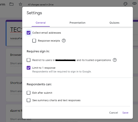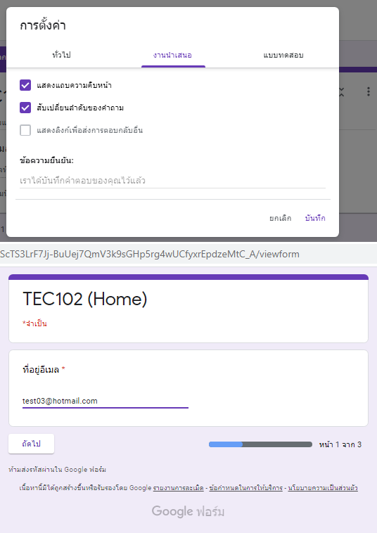 | Collect email address = คลิ๊ก On (พบอีเมลที่กรอกเข้ามา แต่ไม่ใช้อีเมลที่ sign in กับระบบ) |