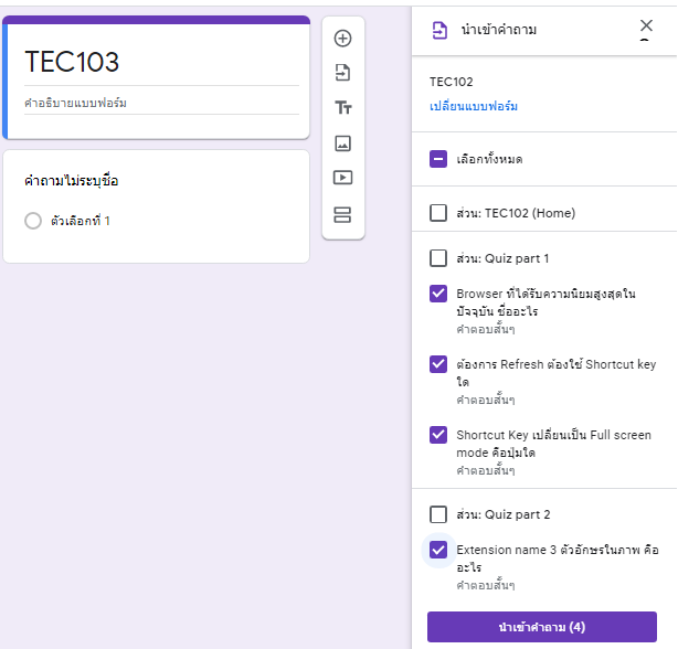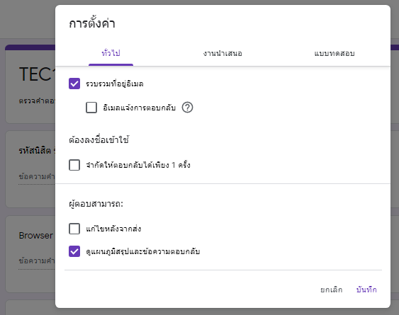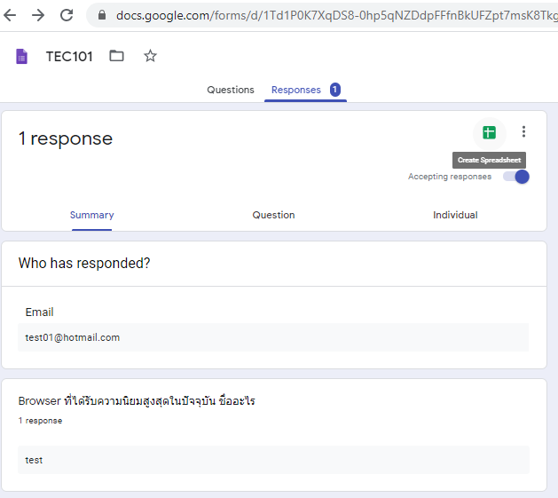 | ยืนยัน Create a new spreadsheet "TEC101temp (Responses)" หรือ Select existing spreadsheet |