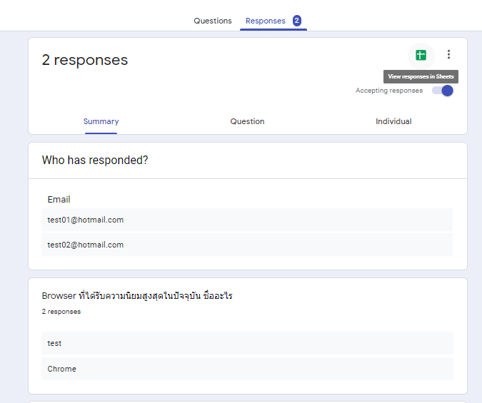 | ด้านบนของกล่องแรก พบ Responses และมีเลข 2 แสดงว่ามีคนทำ 2 คน |