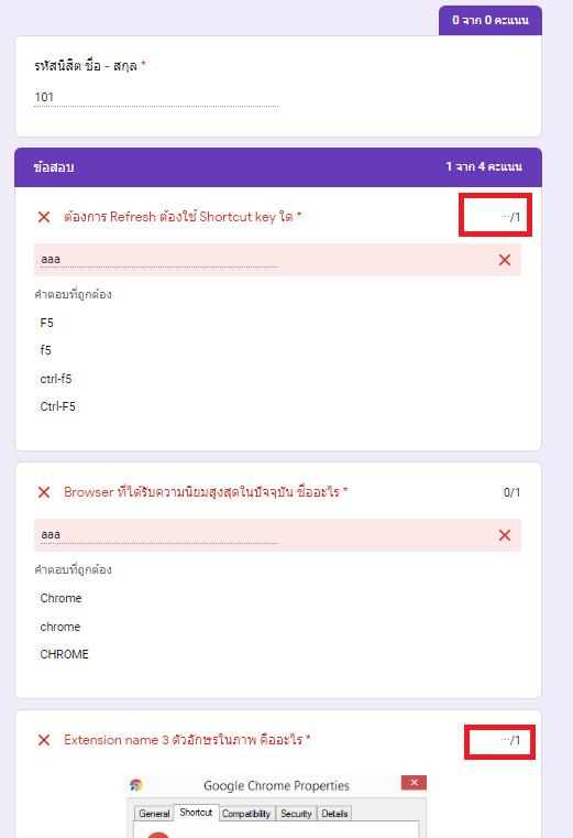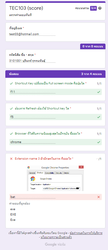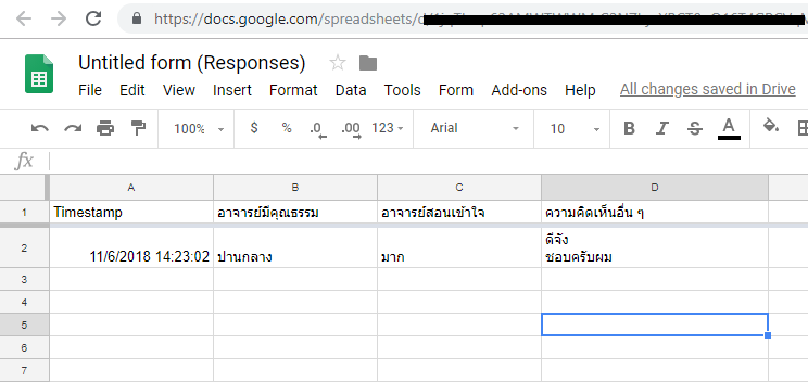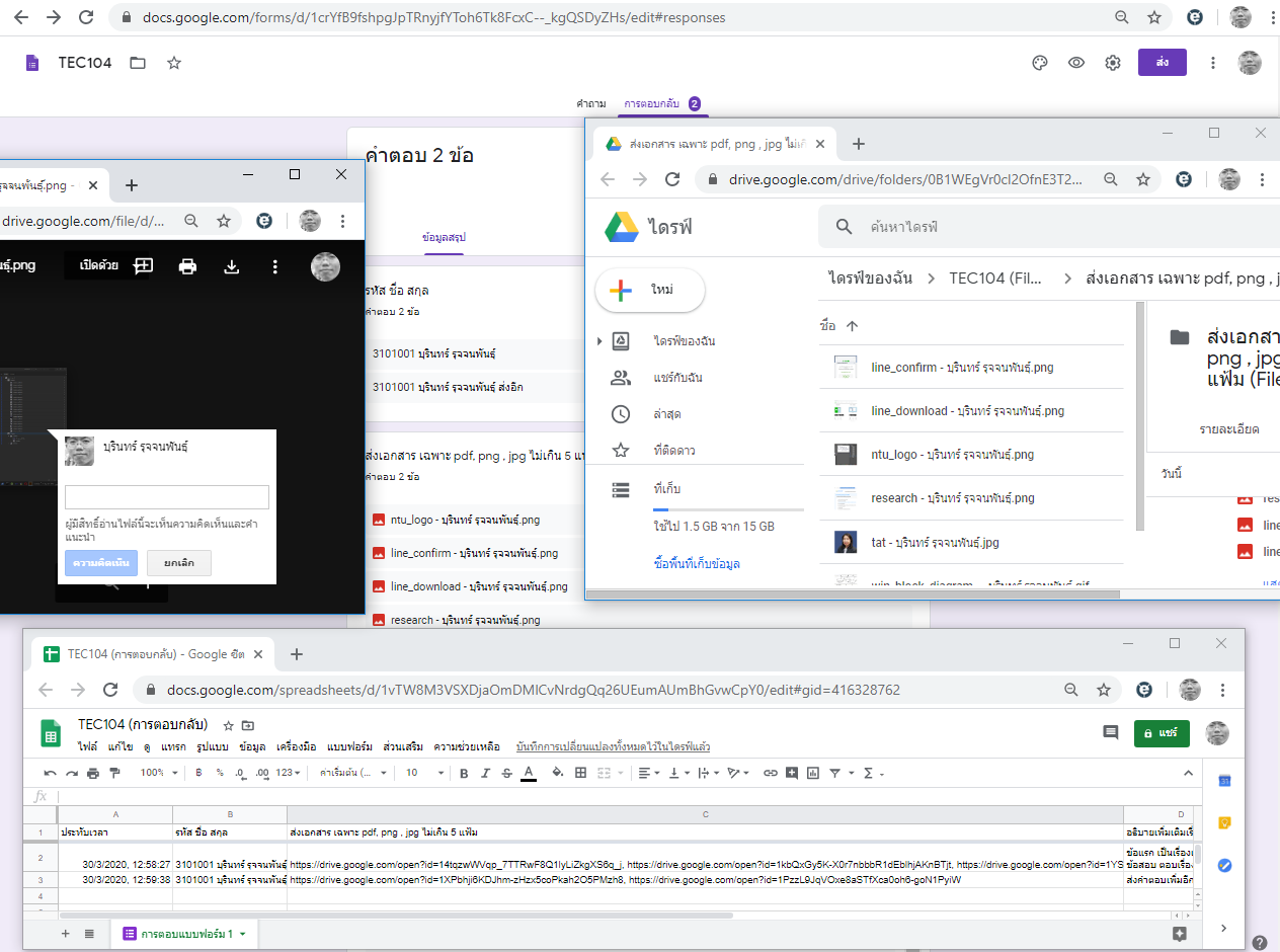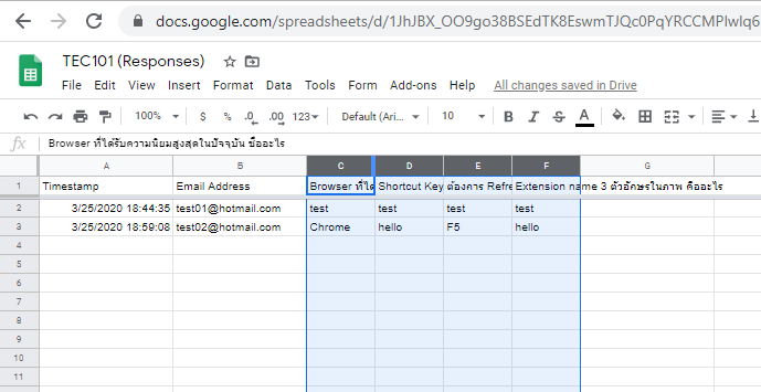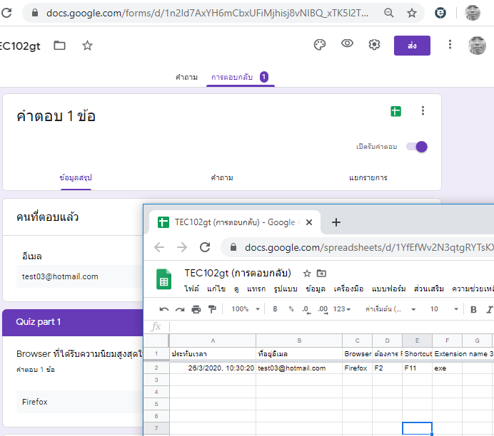 | พบ Google sheet ถูกเปิดใน New window พร้อมข้อมูลการตอบคำถามของนักเรียนทั้งหมด นำไปตรวจให้คะแนนได้ |