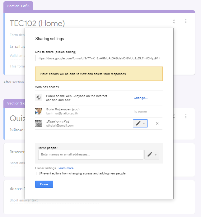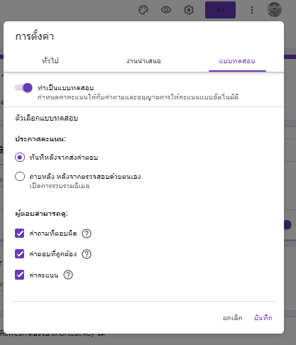 | นำ link ไปแชร์ให้นักเรียนได้เข้าสอบ เปิดให้เฉพาะนักเรียนที่มี G Suite ได้ทำแบบสอบ |