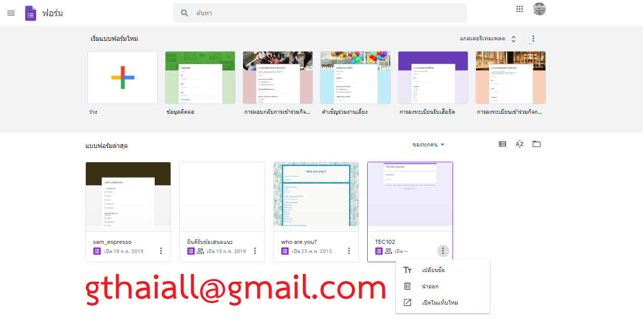 | 1. เปิด https://docs.google.com/forms โดยใช้บัญชี G Suite หรือ Gmail.com เข้าระบบ |