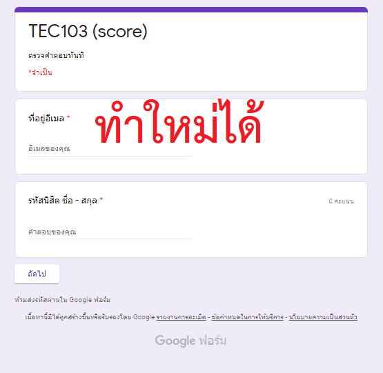| 6. หลังจากส่งแล้ว จะไม่ทราบคะแนน และไม่สามารถทำซ้ำ เนื่องจากตั้งค่าไว้เช่นนั้น |