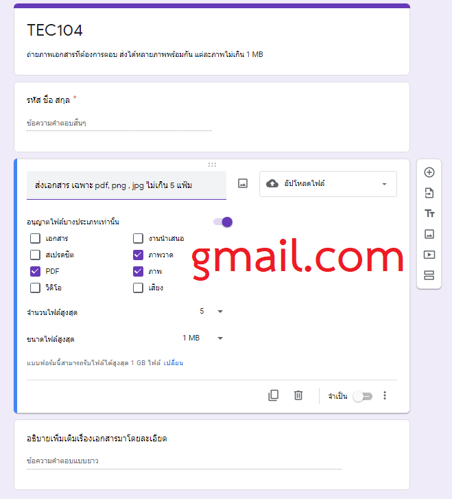 | 3. กรอก ที่อยู่อีเมล = ggg@gmail.com ในกรณีเป็นแบบฟอร์มที่ต้องการ e-mail (อาจไม่ตรงกับที่ sign in ขณะนั้น) |