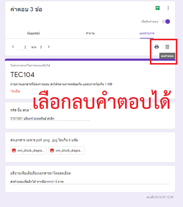 | คลิ๊ก Delete response ที่มุมบนขวา เมื่อต้องการลบคำตอบของนักเรียน ที่อาจเป็นเพียงการทดสอบ |