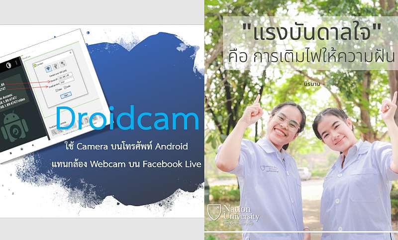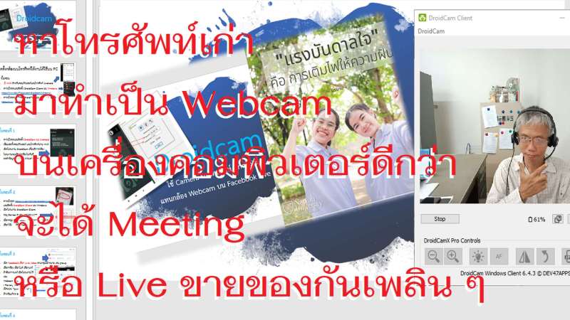 เล่าเรื่องแอป และปัญหาคาใจ 2 เรื่อง ปัญหาแรก น้องสันติ สอบถามเรื่องการ live สด แล้วแบ่งจอภาพเป็นซ้ายขวา แต่ที่เคยเห็นเค้าใช้จอแยก และมีทีมงานช่วยควบคุมการแสดงผล ถ้าทำคนเดียว ก็ต้องเอื้อมมือมากดไปมา ปัญหาที่สอง เครื่องคอมพิวเตอร์ที่ใช้งานอยู่ถูกถอดกล้องไปใช้ที่อื่น และไม่คิดจะหา webcam มาติดตั้ง แต่ต้อง meeting บ่อย ๆ ผ่านเครื่องนี้ จึงเป็นที่มาของการทดสอบทั้ง 2 กรณี พร้อมกับการเก็บ screen ไปทำ slide droidcam หวังจะใช้เล่าต่อไปในอนาคต 1) การแชร์จอภาพบน facebook live แบบเต็มจอ แล้วนำเสนอโปรแกรมต่าง ๆ บนจอภาพ โดยไม่ต้องเชื่อมโยงกับระบบภายในของ facebook live 2) การนำโทรศัพท์เก่าตกรุ่น มาทำเป็น webcam สำหรับเครื่องคอมพิวเตอร์ แต่ก็ต้องใช้งาน wifi และติดตั้งแอปพลิเคชันชื่อ droidcam ได้