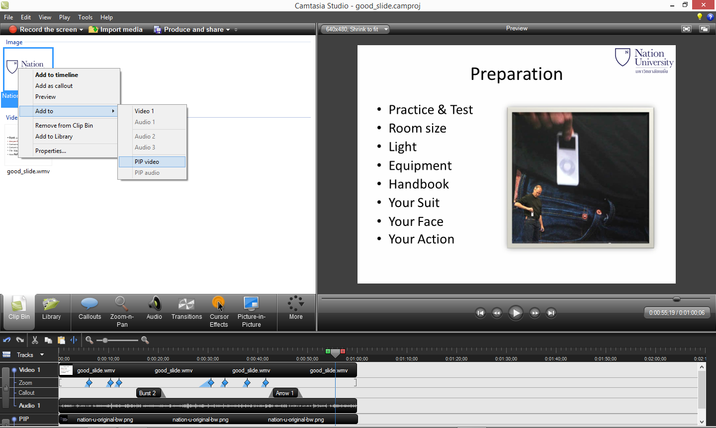 5. กด right click บนแฟ้ม Nation-U-original-bw.png แล้วเลือก Add to Timeline at Playhead ผลคือ โลโก้ จะไปวางบน Track2 และวางทับบน คลิปวิดีโอ ก่อนหน้านี้