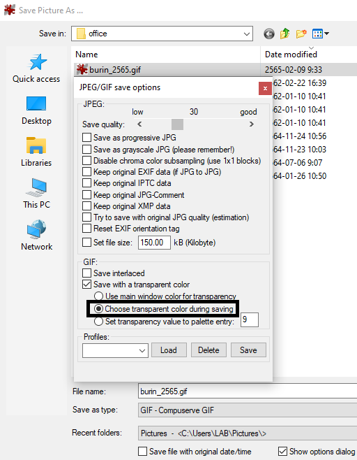 ใช้ Powerpoint วาดภาพ แล้วบันทึกเป็น png แต่ไม่มีให้กำหนด transparent ในรุ่นนี้เมื่อต้องส่ง slide ออกไปภายนอก จึงใช้ irfanview ทำการบันทึกเป็น .gif และ .png โดยเลือก save quality ระดับ 0 และ 6 พบว่า ขนาดต่างกันนับร้อยเท่า การกำหนด Transparent ในช่องคุณสมบัติของ .gif มีตัวเลือก Save with a transparent color : Choose transparent color during saving ทำให้สามารถกำหนดตำแหน่งสีที่ต้องการให้โปร่งใสได้ ในขณะที่บันทึก โปรแกรมที่ใช้เป็นรุ่น iview 4.52 ซึ่งผลลัพธ์คือจัดทำเว็บเพจแสดงภาพที่ burin_2565.htm