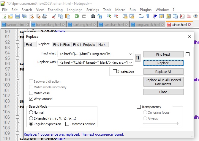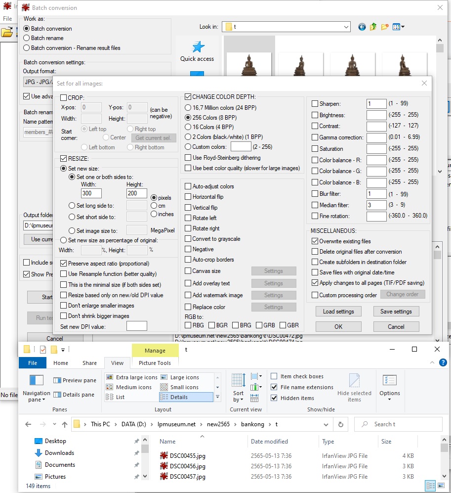 การสร้าง static gallery มีเครื่องมือสำคัญอย่างน้อง 2 โปรแกรมตามภาพ คือ Notepad++ และ Irfanview โดย Notepad++ ใช้สำหรับเขียนโค้ด และจัดการกับแฟ้มจำนวน 180 แฟ้ม การใช้ Regular Expression เพื่อจัดการข้อมูลพร้อมกันในแต่ละกลุ่มข้อมูล ทำให้ประหยัดเวลาในการออกแบบ และแก้ไขโค้ด ส่วน Irfanview ช่วยจัดการ Thumbnail image ได้ ด้วยการสั่งทำงานแบบ Batch กรณีนี้เป็นการสั่้ง Resize ขนาด 6000 px ให้เหลือเพียง 300 px และมีการลดสีเหลือ 256 Colors เพื่อให้ขนาดแฟ้มลดลง ประหยัดเวลาในการดาวน์โหลดข้อมูลมาแสดงผลได้อย่างชัดเจน และมีตัวเลือกอื่น ๆ อีกมากที่น่าสนใจ สำหรับท่านที่สนใจข้อมูลของ พิพิธภัณฑ์ชุมชนในระบบอิเล็กทรอนิกส์ ของ 6 วัด ได้แก่ 1) วัดบ้านหลุก 2) วัดปงสนุกเหนือ 3) วัดไหล่หินหลวง 4) วัดบ้านต๋อมกลาง 5) วัดน้ำจำ 6) วัดบ้านก้อง สามารถเปิดดูรายละเอียดได้ที่ lpmuseum.net