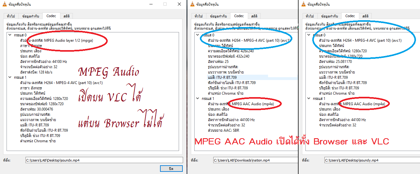 มีเพื่อนคนที่หนึ่ง ทำคลิปวิดีโอแบบ .mp4 ออกมามากมายหลายซีรี่ และมีเพื่อนคนที่สอง ชอบดูซีรี่จากเพื่อนคนที่หนึ่ง ที่เผยแพร่ในระบบ edoc ที่คลิ๊กแล้วเปิดดูแต่ละ episode และฟังเสียงผ่าน chrome browser ได้เลย แต่มีอยู่คลิปหนึ่ง ที่ไม่ได้ยินเสียง สัญลักษณ์บน browser ที่แสดงเสียง ก็เป็น mute คือเปลี่ยนเป็น un mute ไม่ได้ แต่เมื่อนำ link ไปเปิดบน VLC Player บน PC หรือ VLC extension บน Chrome OS พบว่า สามารถเปิดขึ้นมา และได้ยินเสียงตามปกติ เมื่อเปิดดู Codec ของแฟ้ม .mp4 พบว่า กระแสเสียง กำหนดเสียงเป็น MPEG Audio layer 1/2 (mpga) ขึ้นมาเป็นกระแส 0 ส่วนคลิปที่เคยเปิดออกปกตินั้น จะมี กระแส 1 เป็น MPEG AAC Audio (MP4a) ซึ่งคู่กับ กระแสวิดีทัศน์ ที่เป็น H264 - MPEG-4 AVC (part 10) สรุปได้ว่า แฟ้มคลิปมีปัญหา (Corrupted file) แก้ไขโดยตัดต่อ แปลงใหม่ ส่งออกบางส่วน เช่นใช้โปรแกรม VLC Player ตัดบางส่วนออกมา พบว่า Codec ได้แบบเดิม แต่เสียงไม่มีปัญหาทั้งบน browser และ player ทั่วไป ซึ่งกรณีที่แก้ปัญหาได้ถือว่าโชคดี เพราะความเสียหายของคลิปยังไม่มากพอ