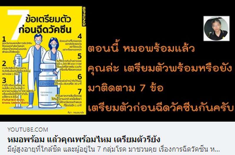 การบันทึกคลิปวิดีโอด้วย Facebook live แล้ว Download มาเป็น .mp4 แล้ว Upload ไปยัง youtube.com โดยใช้เนื้อหาเรื่อง หมอพร้อม และ 7 ข้อเตรียมตัวก่อนฉีดวัคซีน ซึ่งการสลับ scene ใช้การกด alt-tab ส่วนกล้องวิดีโอใช้ Extension / Apps บน Chrome ชื่อ Camera เลือกใช้ได้ทั้ง 2 apps คือ 1) turn camera on 2) chromeos-cameraapp ใน Facebook live จะแชร์แบบ Share : Your Entire Screen และเตรียม Scene ให้เลือกใช้สลับไปมาตามเนื้อหา ดังนี้ 1) Webpage 2) Camera 3) Image บนโปรแกรม Irfan View ซึ่งการบันทึกครั้งนี้ ผลลัพธ์ดูลื่นไหล และเป็นธรรมชาติระหว่างสลับ Scene ในระดับหนึ่ง ซึ่งข้อดี คือ ไม่ต้องติดตั้งโปรแกรมสำหรับถ่ายทอดที่ควบคุมซีน หรือตัดต่อแยกออกมาจากการบันทึกอีกครั้ง