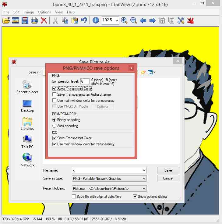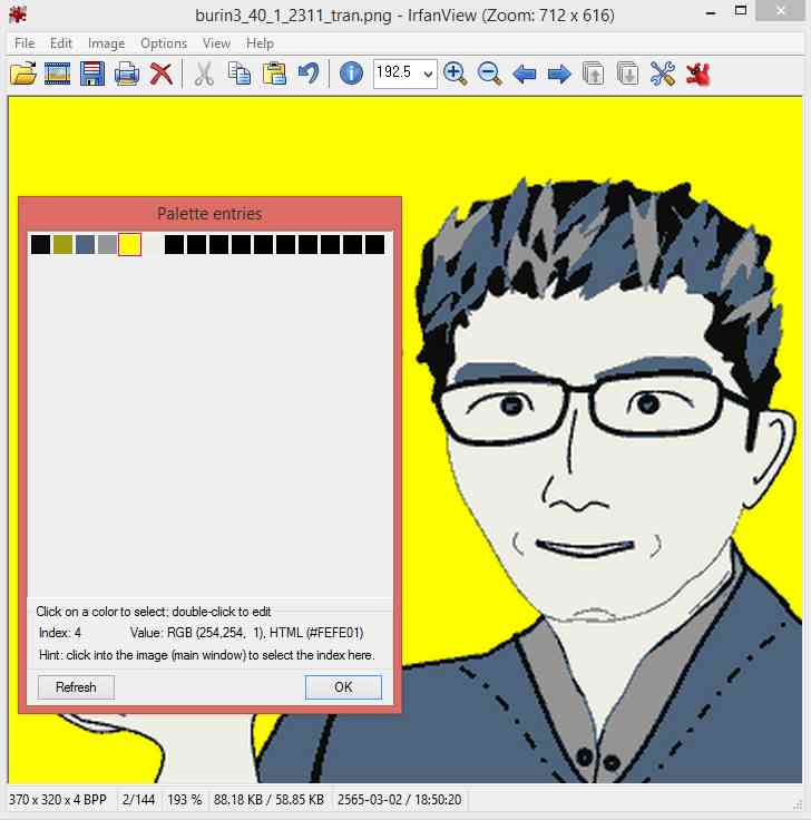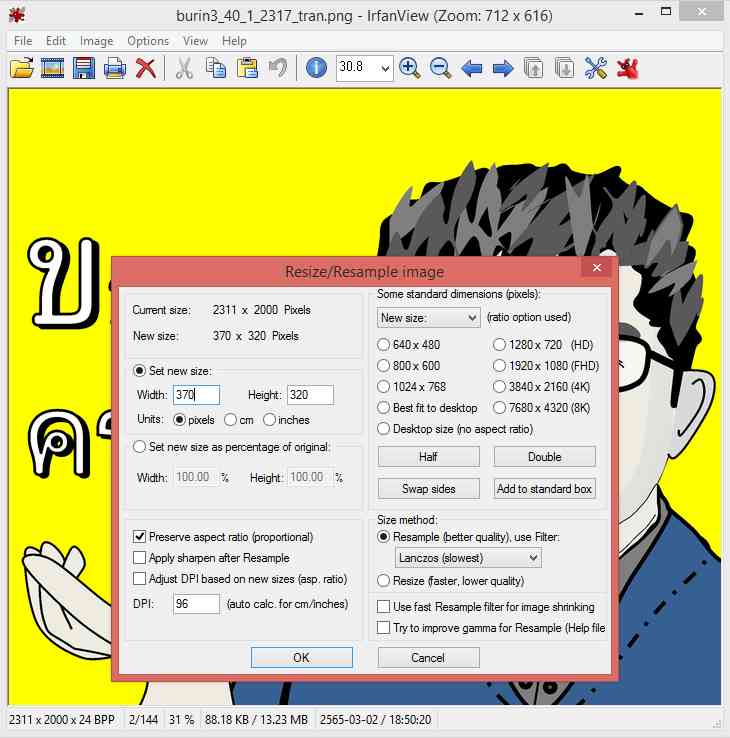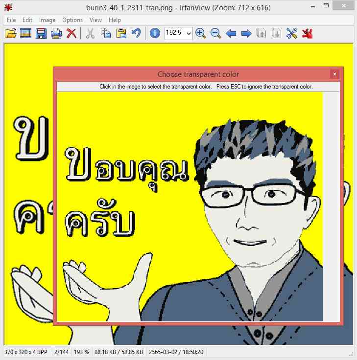 เตรียมภาพทำ line sticker มีขั้นตอนเริ่มจากมีภาพ transparency ขนาด 2311 px * 2000 px ซึ่งสมบูรณ์แล้ว แต่ต้องการเปลี่ยนเป็น 370 px * 320 px จึงใช้โปรแกรม irfanview ทำการลดขนาด โดยไม่ให้คุณสมบัติโปร่งใสหายไป มี 7 ขั้นตอน ดังนี้ 1) เตรียมภาพให้พร้อม 2) ลดขนาด 3) ลดสี 4) ตรวจจานสี 5) บันทึกโปร่งใส 6) เลือกสีที่จะลบ 7) ตรวจสอบผลงาน ซึ่งก่อนหน้านี้ได้ทดสอบ และบันทึกแฟ้มตัวอย่างที่ burin_2565.htm และทดสอบกับภาพ 370px * 320px ที่ได้มาจาก powerpoint คือ love_yellow แล้วแปลงเป็น love_tran