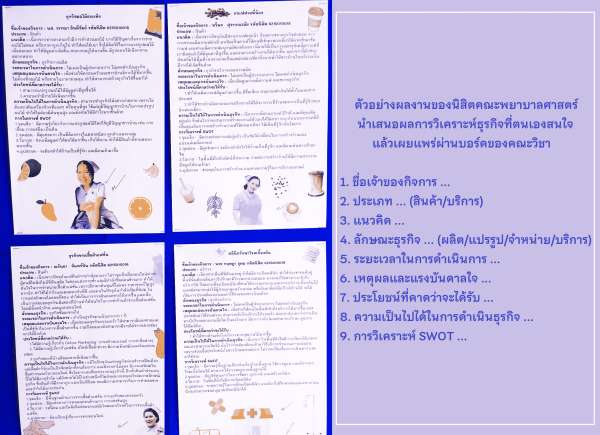 SWOT กับการวิเคราะห์ทางธุรกิจ ของนิสิต ตัวอย่างผลงาน ของ นิสิตคณะพยาบาลศาสตร์ มหาวิทยาลัยเนชั่น ที่นำเสนอผลการวิเคราะห์ธุรกิจที่ตนเองสนใจ แล้วเผยแพร่ผ่านบอร์ดของคณะวิชา เช่น ผลไม้อบแห้ง กาแฟ เสื้อผ้าแฟชั่น คลินิก โดยมีหัวข้อที่ทำการวิเคราะห์ ดังนี้