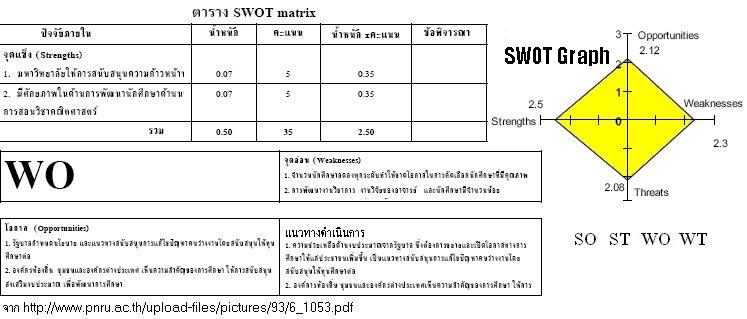 มีประเด็นที่ประกอบด้วย จุดแข็ง จุดอ่อน โอกาส และภัยคุกคาม (SWOT = Strength, Weakness, Opportunity และ Threat) คือ การสำรวจตรวจสอบสภาพภายในองค์การและสภาพแวดล้อมภายนอก เป็นส่วนหนึ่งของกระบวนการวางแผน เพื่อให้แผนนั้นได้ใช้ประโยชน์จากสิ่งที่มีอยู่และแก้ปัญหาที่ไม่พึงประสงค์ โดยอาศัยทั้งปัจจัยจากภายในและภายนอกมาเป็นฐานคิดสำหรับกำหนดแผนงานโครงการ