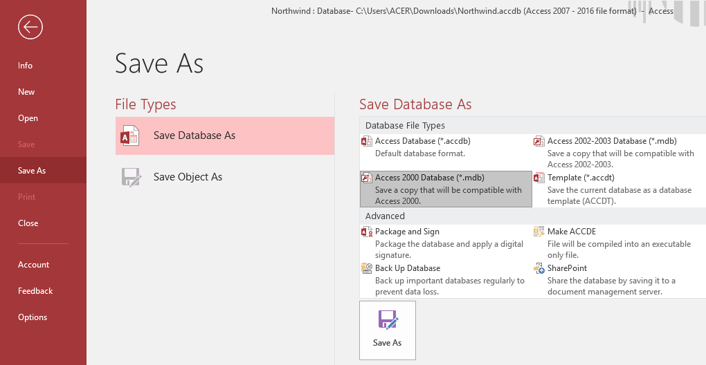 ซึ่ง Microsoft Access 2007 - 2016 ยังสนับสนุนการ Conversion ลงไปเป็น .mdb ได้ แต่แฟ้มที่สร้างจากรุ่นเก่าจะไม่ support ให้เปิดในรุ่นใหม่