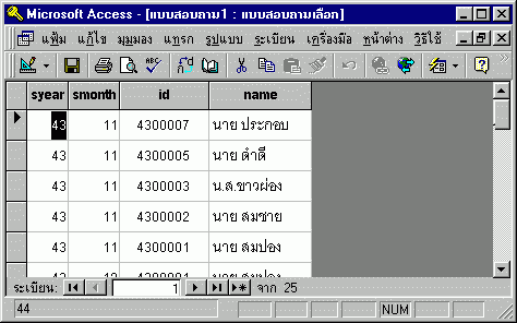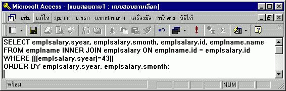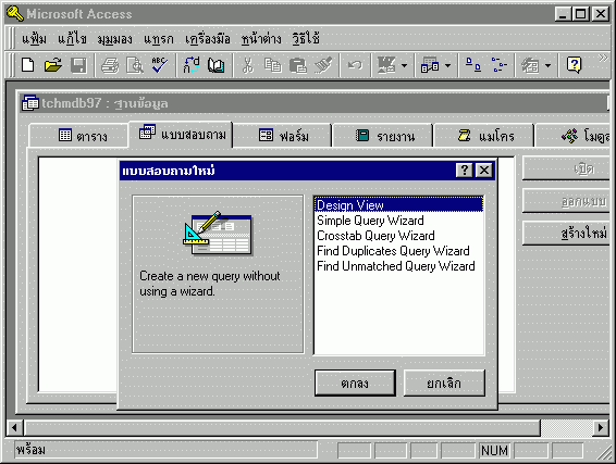 > ข้อควรทราบ <Query คือความสามารถที่ยอดเยี่ยมในการเรียกข้อมูล ในภาษาอื่น ๆ ต้องใช้ SQL เขียนเพื่อเรียกข้อมูล แต่ใน ACCESS สามารถสร้าง Query แล้วนำไปใช้ได้ทันที