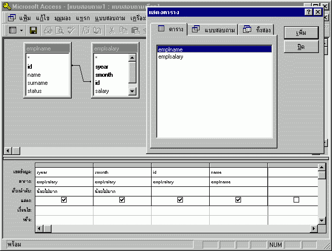 ขั้นตอนที่ 2 : เลือกตารางมา 2 ตาราง ถ้า field ชื่อเดียวกัน และเป็น primary key จะทำการ link กัน อัตโนมัติ แต่สามารถยกเลิก หรือลากไปสัมพันธ์กัน หรือจะ Double click ที่เส้น เพื่อกำหนดความสัมพันธุ์ก็ได้ แล้ว Double ใน Field ของตาราง เพื่อกำหนด Field ที่ต้องการนำมาแสดงผล
