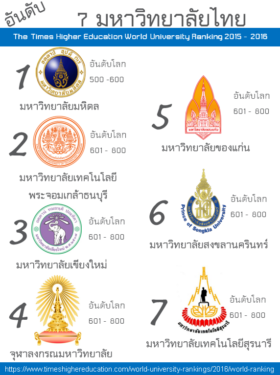 บว่า ผลการจัดอันดับมหาวิทยาลัยในไทย ที่จัดโดย THE เป็นผลของปี 2015-2016 พบว่า ถ้าดูจากภาพรวม ในแต่ละช่วง เช่น 601-800 จะเรียงตามอักษรมีไทยเข้าไป 6 มหาวิทยาลัย ทำให้มหาวิทยาลัยเชียงใหม่ ปรากฎขึ้นมาก่อน แล้วคุณ [Itsaree Ya] แนะนำในกลุ่มว่าให้ดูที่ Asia Ranking แล้วเลือก Thailand จะพบการจัดอันดับตามคะแนน ผลเรียงตามคะแนน คือ มหาวิทยาลัยเทคโนโลยีพระจอมเกล้าธนบุรี มีคะแนนเป็นอันดับ 2 ของไทย ใน The Times Higher Education World University Ranking 2016 ส่วนอีกกว่า 170 มหาวิทยาลัย ไม่ได้เข้าไปในผลการจัดอันดับ หรือมีเพียง 7 มหาวิทยาลัยไทยอยู่ในแปดร้อยมหาวิทยาลัยโลกที่เข้าเกณฑ์